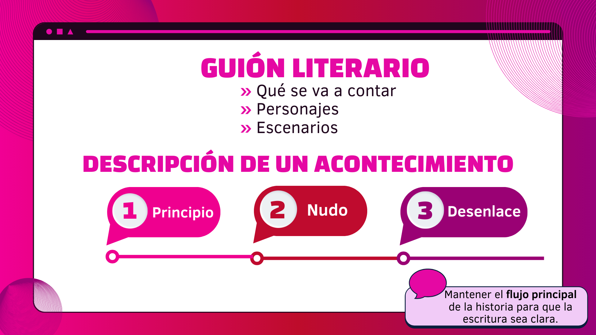 Aquí se desarrolla qué se va a contar, personajes y escenarios, a través de un guión literario.